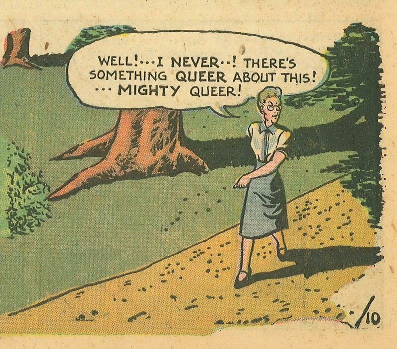 fig. 0.12 : Dans ce comic à la source inconnue, une femme s’exclame «  There’s something mighty queer about this!  », qui dans ce contexte peut être lu comme «  Il y a là quelque chose de vraiment bizarre !  ».