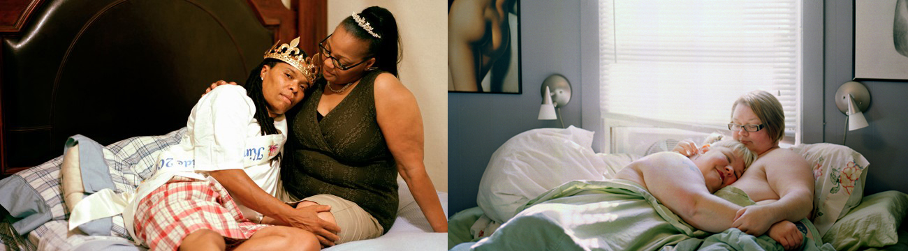 Un nombre important dʼinitiatives artistiques fait écho à ces tensions entre normalisation des queers et queerisation des formes familiales traditionnelles. Ce nʼest pas un hasard si la photographie de famille est un référent fort dans la majorité des projets que je mʼapprête à exposer. Le contrat administratif et légal, ou encore lʼensemble de murs à habiter ne sont que quelques-uns des moyens qui fabriquent la famille hétérosexuelle et le genre. La photographie familiale, souvent posée dans le salon, est un exemple dʼun tel dispositif. Cette typologie dʼimage est indissociable du processus de monstration qui consiste à exposer la photographie dans le contexte domestique lui-même ou sur le lieu de travail. Bien entendu, les photographies que jʼévoquerai ici sont dʼabord des fragments de lʼœuvre de photographes que jʼappréhende comme des propositions artistiques : néanmoins, par leurs codes, ces images évoquent la photographie amateure ou la pratique vernaculaire du portrait familial pris chez le photographe. Trois projets retiennent mon attention : le projet States of Union par Alice Smith (2008) ; le projet Embodiment, A Portrait of Queer Life in America (2011) par Molly Landreth et Amelia Tovey et enfin la série Pink Choice* (2017) par Maika Elan. Enfin, lʼarchive vivante de personnes queer dans leur cuisine composée par le site autostraddle