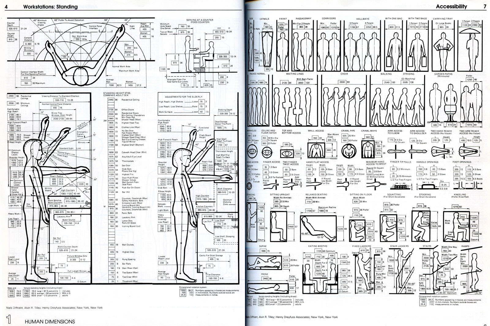 Du point de vue des designers, la question de la norme, du normal et de lʼanormal est également centrale. Les designers composent sans cesse avec les normes légales, mais aussi avec celles qui sont liées à la représentation de ce quʼest un corps, de ce quʼil peut, de la façon dont il sait et doit se mouvoir dans lʼespace. Ces normes sont utiles au travail de læ designer. Par exemple, lʼarchitecte sait quel espace maximum laisser entre deux barreaux dʼune rambarde : cette mesure vient de la taille moyenne dʼun pied dʼenfant, afin que les plus jeunes évitent de se coincer et de se blesser les membres dans le dispositif. Un·e graphiste sait quʼen dessous de sept points, un texte sur papier devient illisible pour les voyant·es, et quʼune taille de seize points sʼimpose même pour répondre aux problèmes de vue les plus courants. Iel sait aussi que son code HTML, généré pour créer un site Web, doit correspondre à certaines normes sémantiques pour être interprété par les moteurs de recherche, ou encore les lecteurs dʼécran, ces outils utilisés par les mal ou non-voyant·es pour consulter le Web. Connexe à la notion de norme, le concept de normalité doit pourtant être approché de manière critique par læ designer. En respectant des normes, le design participe dʼune «  prescription optimale des actions et des gestes  », créant alors des «  objets-types scriptant une fonction-type  » (Kazi-Tani 2018). Mais la normalisation se produit même en amont de la production, par exemple par la sélection de ce qui est digne dʼintérêt : en effet, «  les solutions et processus du design définissent ce qui est socialement pertinent  »55 (Del Gaudio, Tanaka & Onzi Pastori 2021, 159). Ce sont aussi des outils et documents propres aux professions de designer et architecte qui participent de normes potentiellement enfermantes, discriminantes et aliénantes. À cet égard lʼouvrage Architectural Graphic Standards (AGS), qui a connu 11 rééditions depuis 193256, est souvent critiqué, par exemple par Félixe Kazi-Tani (2018) ou Léopold Lambert (2011, 2012, 2017) (fig. 0.23.b).