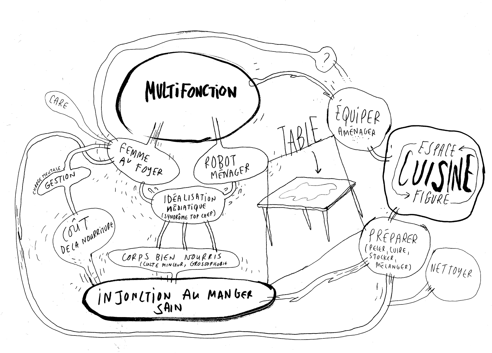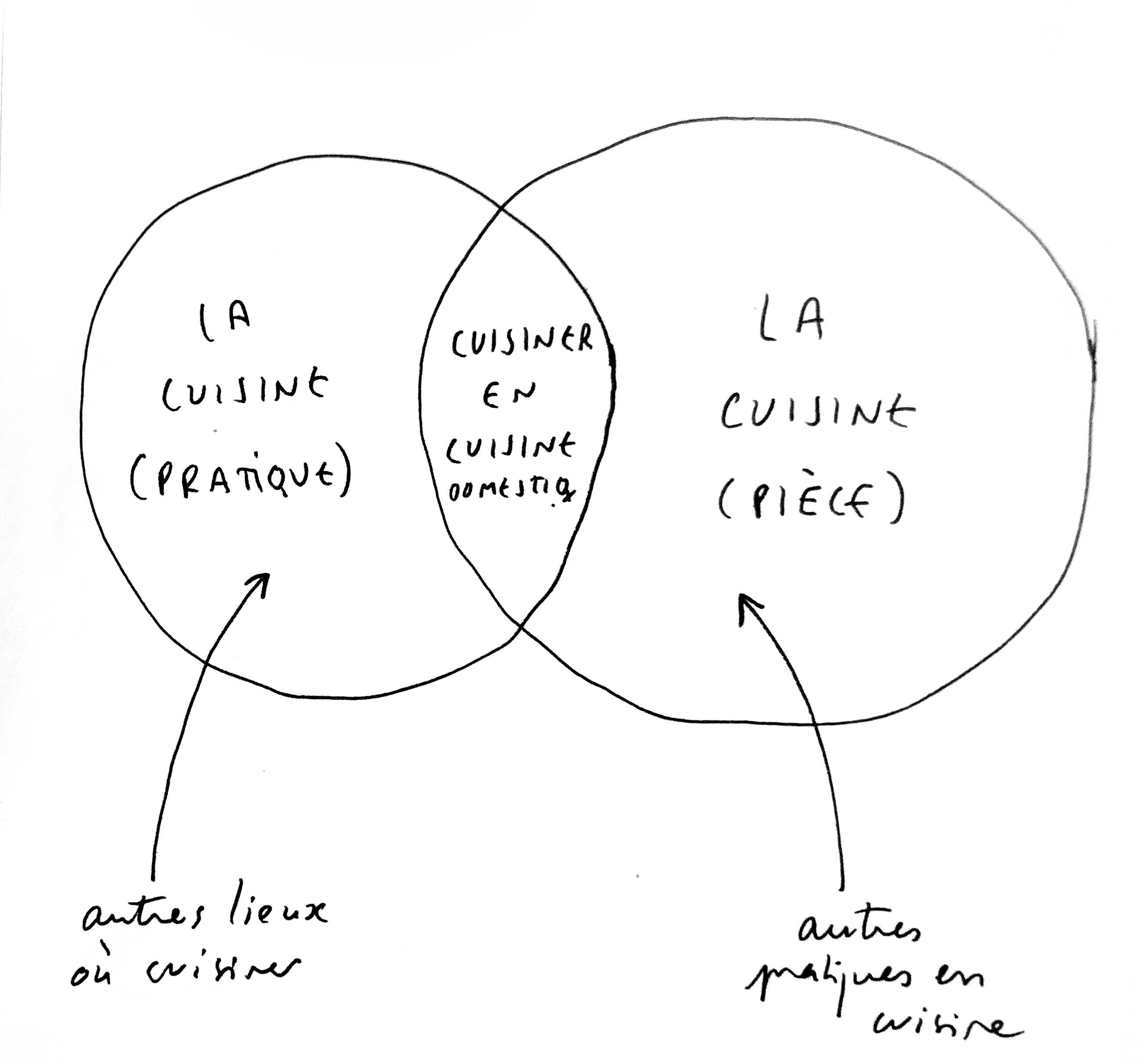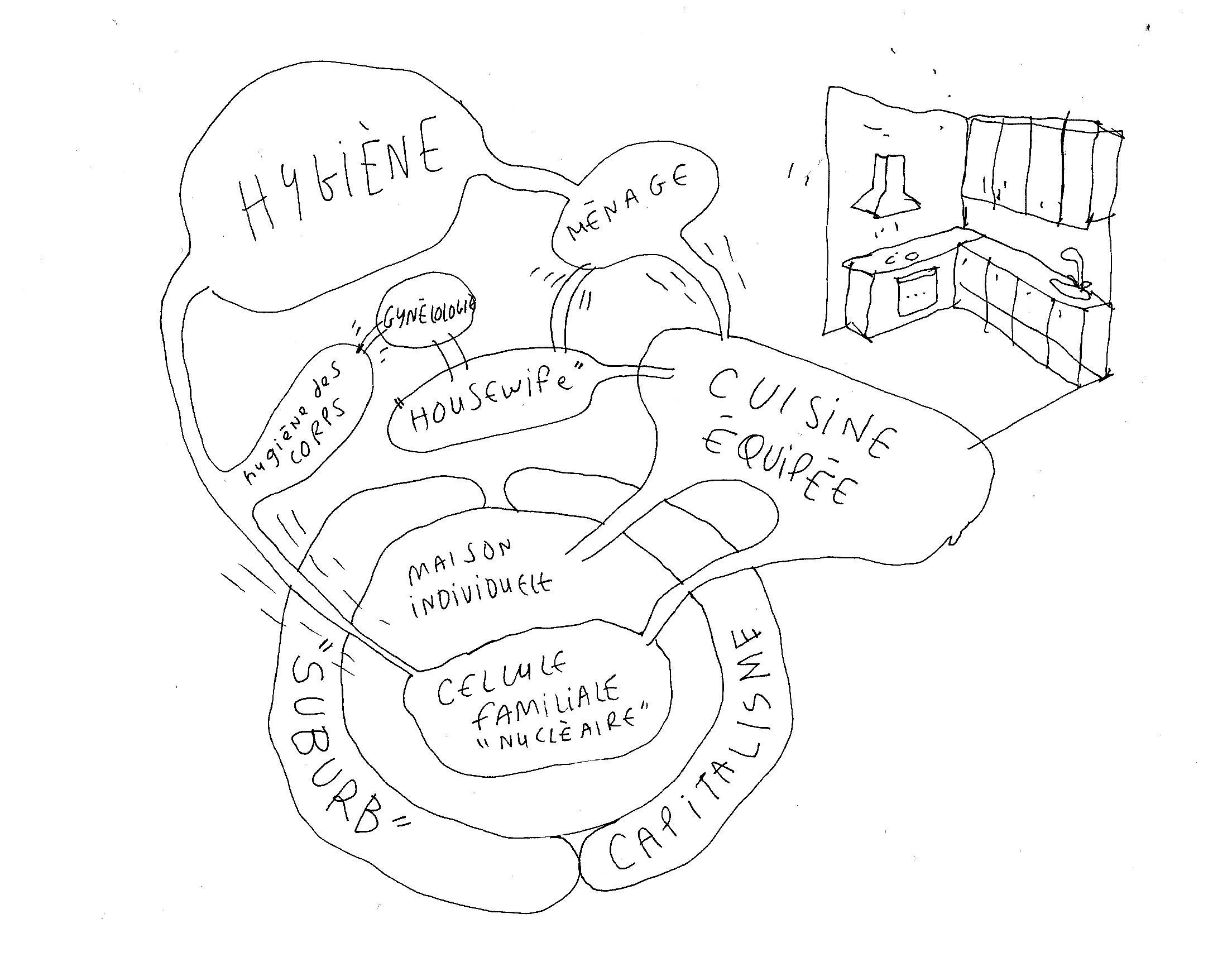 Penser lʼoppression en termes spatiaux, surtout en des termes aussi concrets que ceux de lʼarchitecture et du design est donc au fondement de ma proposition, qui vise, dans la lignée dʼAudre Lorde et Sara Ahmed notamment, de planifier la cuisine queer comme démantèlement des normes. Ce travail nécessite bien entendu un état des lieux, voire, puisque la question est spatiale, un plan ou une cartographie. De quel territoire la cuisine est-elle une annexe ? Comment penser lʼattachement des femmes à la cuisine et lʼespace domestique de manière critique et spatialisée ?