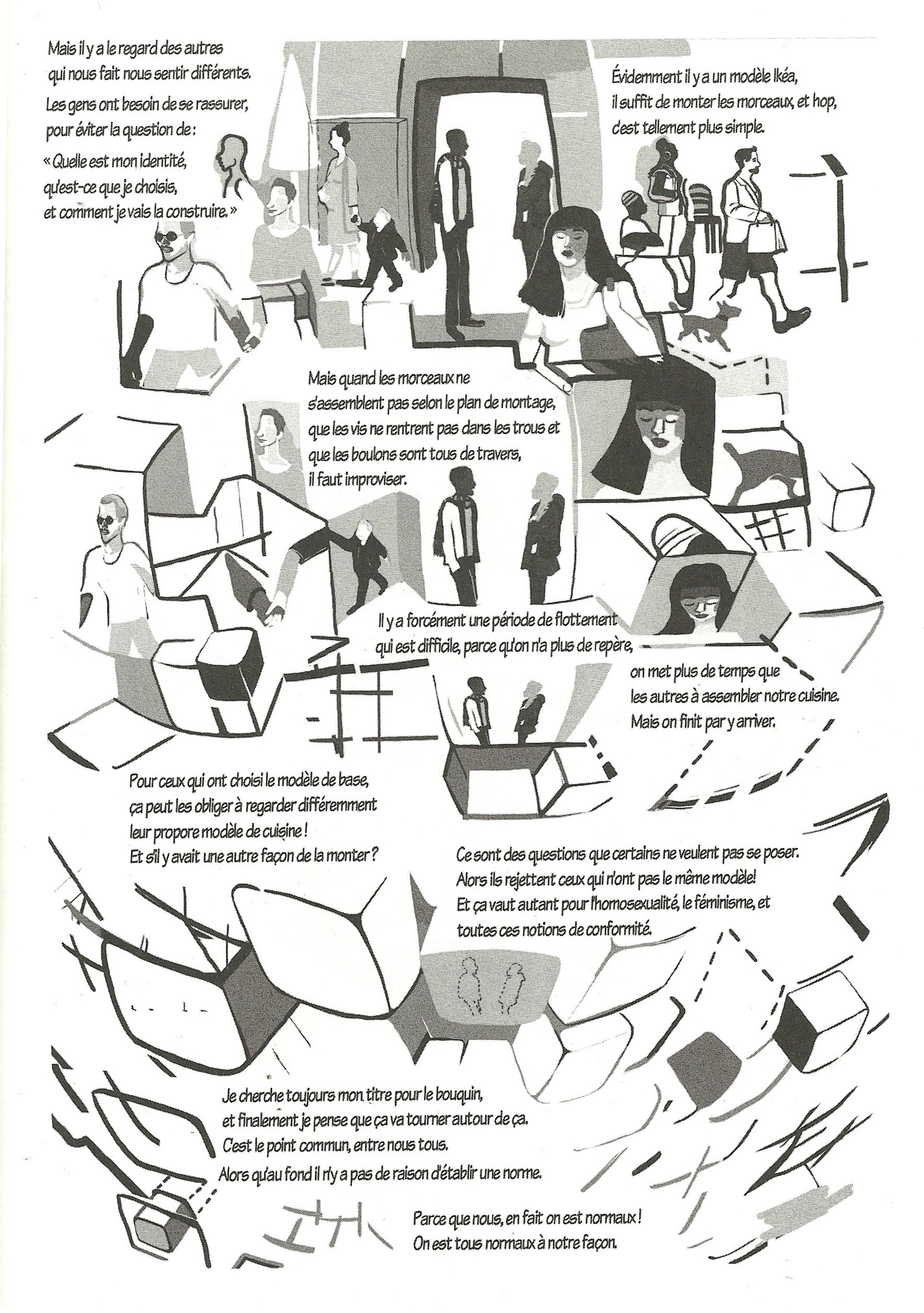 fig. 0.4 : Dans la bande dessinée Les gens normaux (2013), la dessinatrice Audrey Spiry donne vie au récit de Bénédicte, femme trans qui compare son corps à l’aménagement d’une cuisine (p. 211). Le corps prend place dans lʼespace, mais il est aussi lui-même un espace, potentiellement une architecture, une maison, un logis. Comme un logis, le corps sʼaménage, se meuble, sʼagence : telle est la réalité contemporaine que Bénédicte traduit, faisant ainsi écho à la dimension plastique et éditable du corps soulignée par Paul B. Preciado dans Testo Junkie (2008). En tant que personne transmasculine, engagée, si lʼon tient à ce terme, dans une forme de transition, je suis frappé par cette comparaison, dʼautant plus quʼelle crée une tension vraiment poignante entre «  quitter la cuisine  » et «  ne pas la quitter  ». Se libérer, en tant que femme ou personne assignée femme, ce nʼest plus quitter un lieu en guise de mouvement libératoire ; cʼest faire de son corps le lieu, tâcher de lʼhabiter et de lʼéprouver. Lʼimportance de la cuisine ne tient pas uniquement à une métaphore, que lʼon pourrait dʼailleurs juger fortuite. La cuisine vient, revient, dès que lʼautonomie féminine et féministe est engagée ; non pas comme contre-modèle, mais comme espace où se rassembler, se soigner, prendre soin de soi.