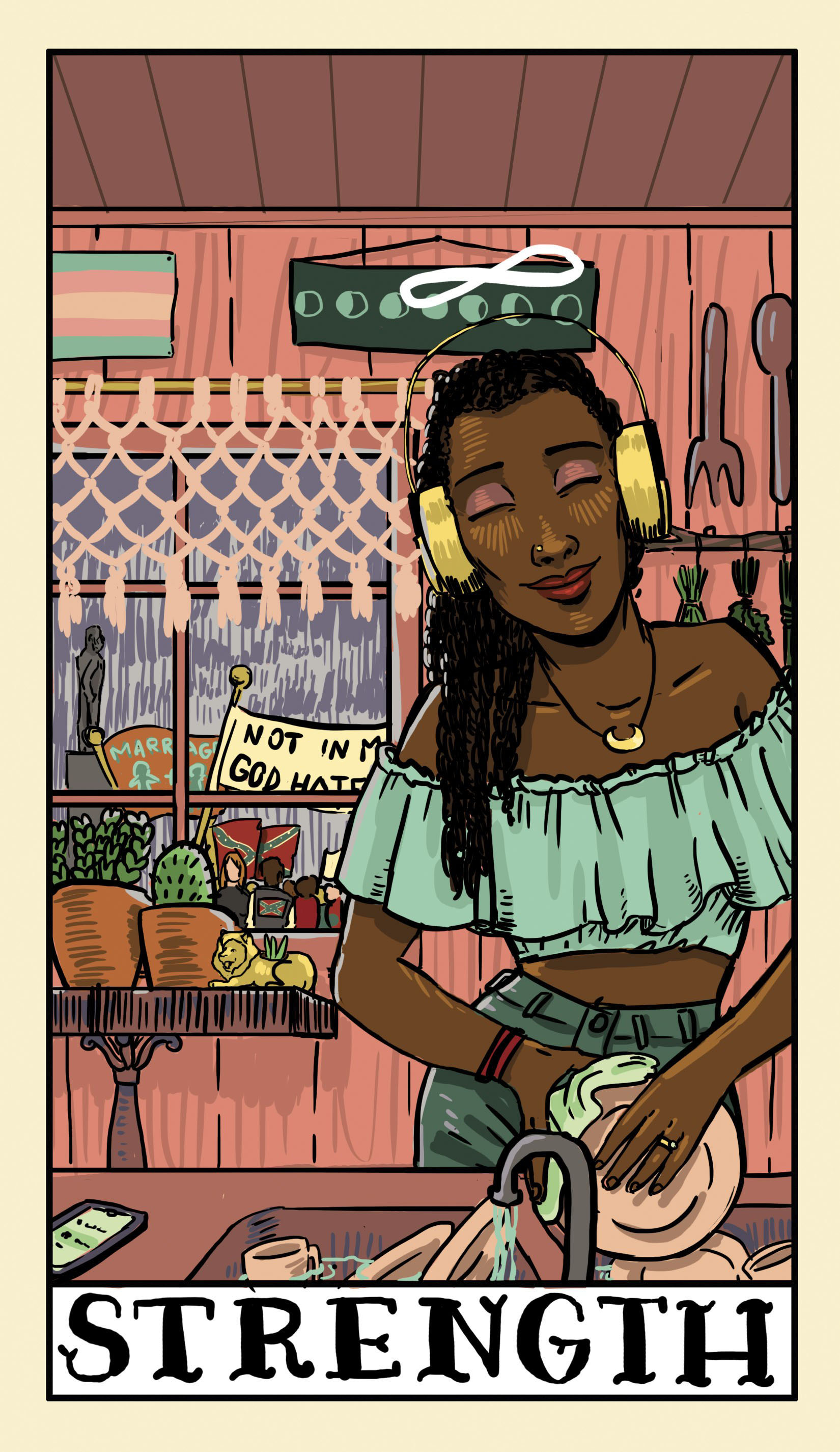 fig. 0.5 : Le tarot de marseille se constitue entre autres de 22 arcanes majeures, numérotées de 0 à 21. La carte 9 (parfois numérotée 8), La Force, est ici représentée dans le Delta Enduring Tarot (2017), tarot militant, avec les traits d’une femme noire trans faisant la vaisselle.Après le dessin de la cuisine-corps de Bénédicte, cʼest dans un jeu de Tarot divinatoire militant7 (le Delta Enduring Tarot paru en 2017) que je rencontre lʼimage dʼune femme noire trans faisant la vaisselle8. Casque audio vissé sur les oreilles, elle ignore les «  haters  » qui se massent à la fenêtre avec leurs pancartes queerphobes9. Cette carte est celle de La Force, une carte qui, dans lʼeschatologie tarologique, peut représenter la force intérieure dʼune personne, mais aussi ses excès et leur déploiement excessif. Dans le traditionnel jeu de tarot Rider Waite-Smith, la Force est représentée par une femme blanche, qui caresse un lion si soumis quʼelle peut glisser la main dans sa gueule. Dans le tarot Delta, la Force est représentée comme résilience ; il ne sʼagit plus de dompter ses propres excès, mais de faire face à lʼhostilité et aux discriminations qui maillent lʼexpérience de nombreuses personnes minoritaires, et tout particulièrement des femmes noires trans10. Le texte qui décrit la carte sur le site Web du jeu est explicite :