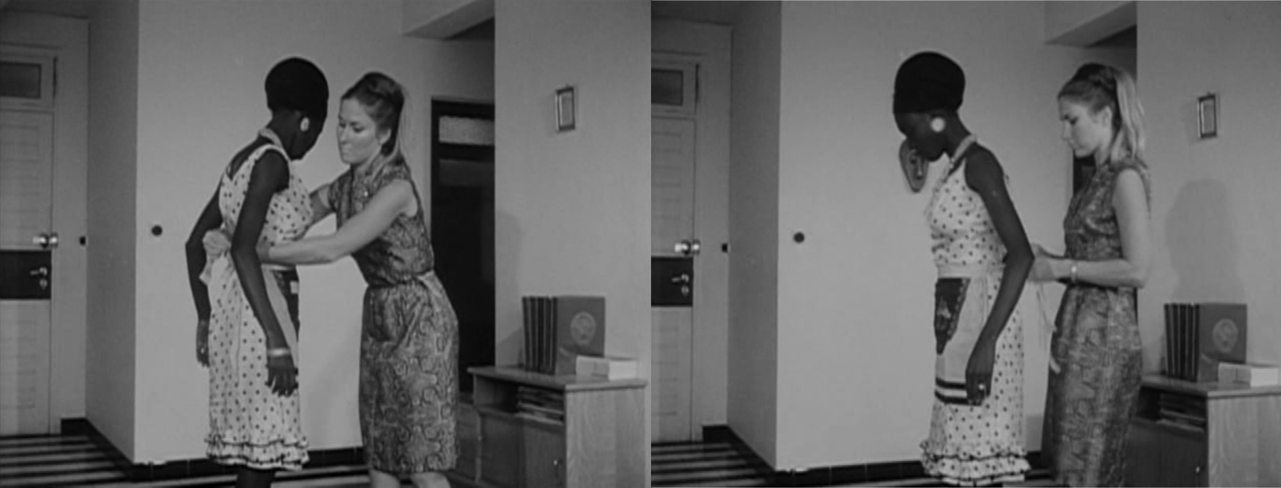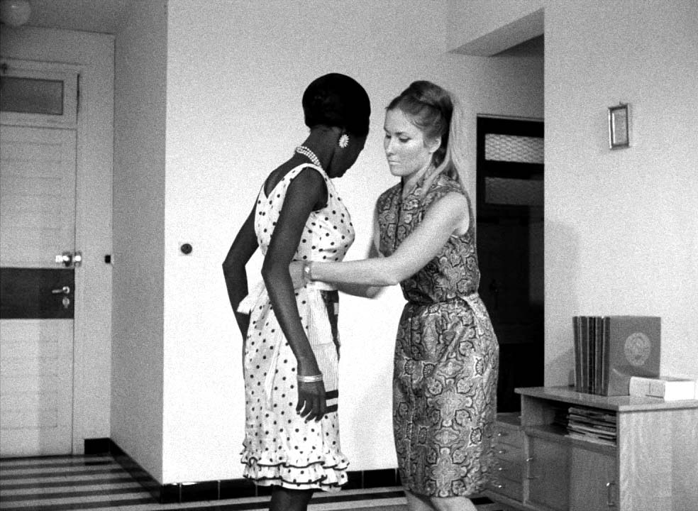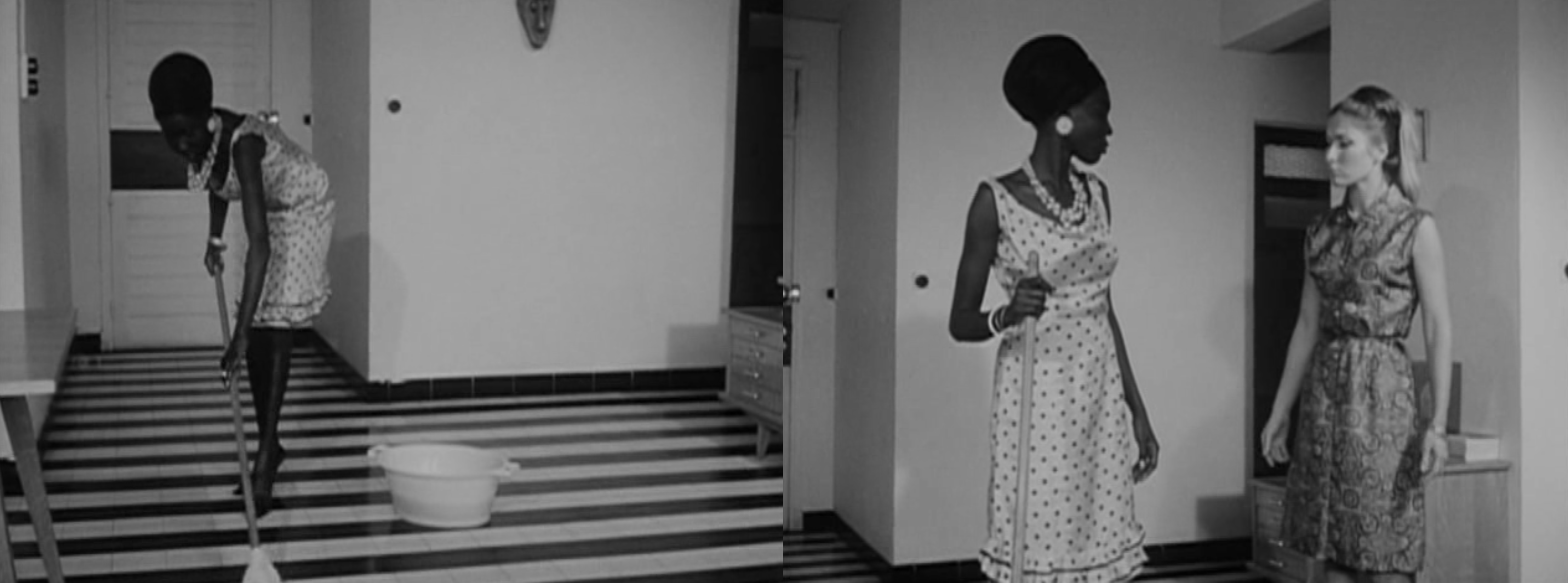 fig. 0.6 : Dans La noire de… (1966), Ousmane Sembène raconte l’histoire de Diouana, venue de Dakar à Paris pour continuer après l’été à être la baby-sitter d’une famille française connue au Sénégal. Je reviens sur ce film dans le chapitre III. Pendant que la domestique sʼoccupe de lʼentretien de la domus, en faisant sols et poussières, la domus produit la domestique comme subalterne, à lʼidentité recomposée ou effacée15. La colonialité repose en effet sur la constitution dʼun Autre qui révèle, par un effet de miroir, les qualités du maître (Hill Collins 1990, 68–70). Ainsi, la domestication du domestique racisé présuppose un état de sauvagerie préalable, appelé à être régulé par la domus et irrigué par les qualités civilisées du maître (qui est quant à lui naturellement civilisé). Enfin, des dynamiques genrées traversent le logis. La boniche est à la maison parce quʼelle est une femme, et la maison en retour participe de la fabrique de sa féminité : en cela, le logis est un sceau autant quʼune cage. Nous verrons comment le soin et la propreté de la maison (littérale, une maison sans taches ni poussière) recoupe la propreté symbolique de lʼépouse, matérialisée par le soin que la boniche apportera à sa propre apparence. En somme, même si je me dois encore de faire plus complètement cette démonstration, il apparaît quʼen Occident, féminité, blancheur et bourgeoisie sont coproduits par le dispositif de lʼhabitat individuel. Ce sont bien ces trois axes, race, classe, genre, qui animent la production de la domesticité, mais parfois de manière contradictoire ou conflictuelle.