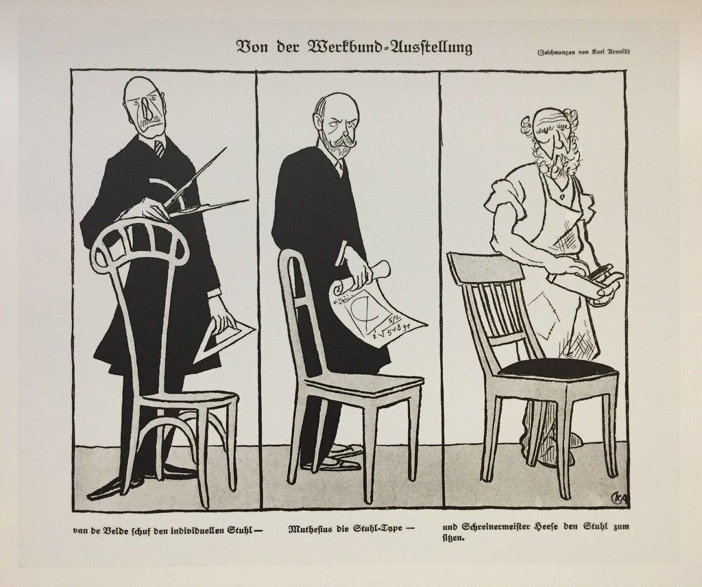 fig. 0.7 : Dans cette célèbre caricature de Karl Arnold diffusée dans le périodique allemand Implicissimus (1914), on découvre Henry Van De Velde proposant sa chaise dessinée, Muthesius et le type moderniste, et enfin l’artisan et sa chaise au dessin traditionnel, ponctuellement vu comme trop encombré et représentatif des excès décoratifs dans le modernisme doit libérer les usager.e.s. Si la tension entre ornement et fonctionnalisme a largement été documentée par les historien·nes du design, la dimension genrée de la moralisation du décor est moins souvent mentionnée, et très souvent absente des cours dʼhistoire du design19. Lʼouvrage dirigé par les théoricien·nes de lʼarchitecture Hilde Heynen et Gülsüm Baydar permet de retracer lʼhistoire du rejet de lʼornement, qui peut être compris comme un geste purgatif vis-à -vis de lʼordre du Second Empire, de la bourgeoisie, du capitalisme industriel encore naissant, et enfin du féminin. Adolf Loos définit le «  sujet accompli  » comme ayant rejeté lʼimpasse morale et esthétique de lʼornement, et en tire les conséquences qui sʼimposent pour lʼensemble de la gente féminine :