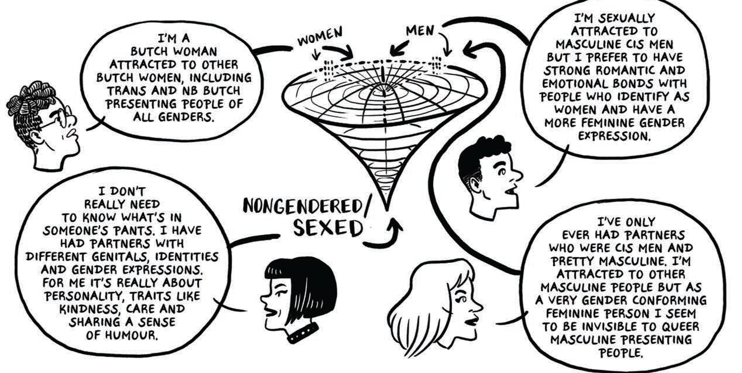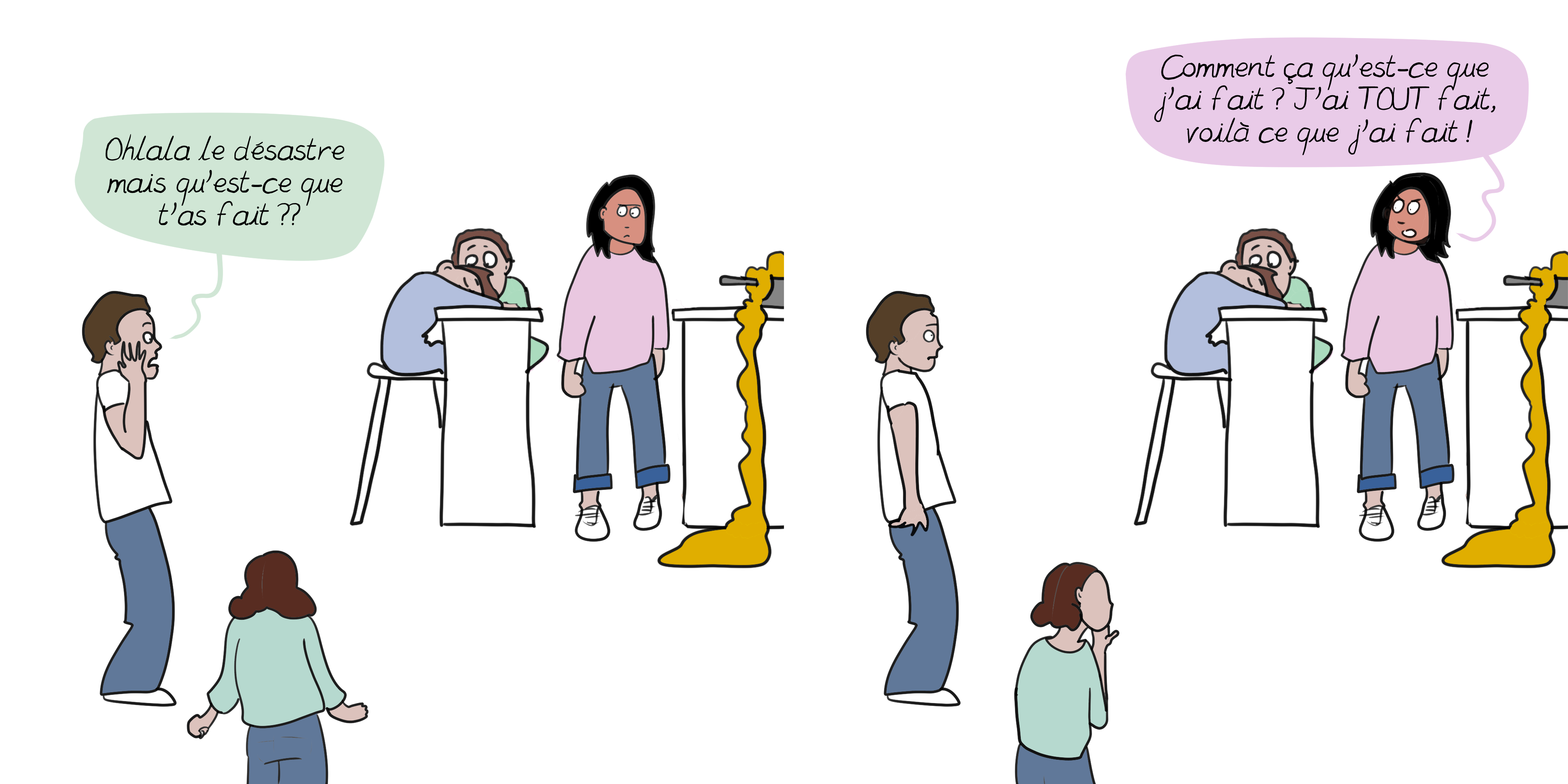 Ce paysage est brossé à gros traits ; esquisser le portrait des relations des occidentaux·ales avec leurs espaces domestiques est ambitieux et requiert un travail historique et théorique qui semble pour le moins titanesque, quand bien même on sʼintéresse plus spécifiquement à la cuisine, comme cʼest mon cas. On pourrait même abandonner lʼentreprise en écartant les observations précédentes, au profit dʼun pas de côté : à quoi bon encore parler de la cuisine ? Nʼest-elle pas une pièce obsolète, ou en tout cas secondaire, dans un monde occidental contemporain qui préfère les plats préparés, la livraison de mets par Deliveroo et les sorties au restaurant ? En somme, est-ce quʼil y a encore de la cuisine (dans le sens de pratique culinaire) dans la cuisine (dans le sens dʼespace domestique) ? Et sʼil se passe encore des choses en cuisine, peut-on vraiment leur prêter une dimension politique, comme Brigitte Fontaine préfère chevaucher sa moto à faire des confitures ? Ne serait-il pas tentant de déclarer cette opposition dépassée, et de changer de stratégie de lutte ? Ma décision de travailler sur la cuisine comme lieu éminemment conflictuel, paradoxal et politique ne tient pas uniquement de lʼenvie, même si ma passion pour la vie en cuisine nʼest pas étrangère au projet. Ces dernières années, jʼai collecté intuitivement des signes discrets, autant de petits cailloux qui tracent un chemin jusquʼà la cuisine. Cʼest en lisant la bande dessinée Les gens normaux (2013), qui raconte des parcours de vie et expériences de personnes LGBTQIA+6 que je rencontre Bénédicte, une femme trans qui compare son parcours de transition avec lʼéquipement dʼune cuisine.