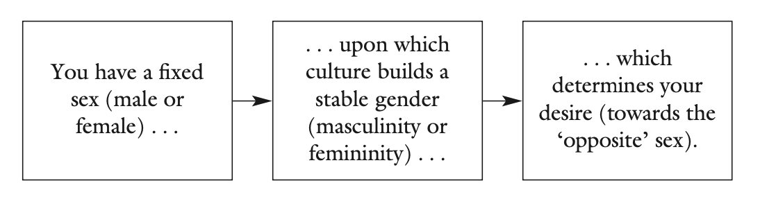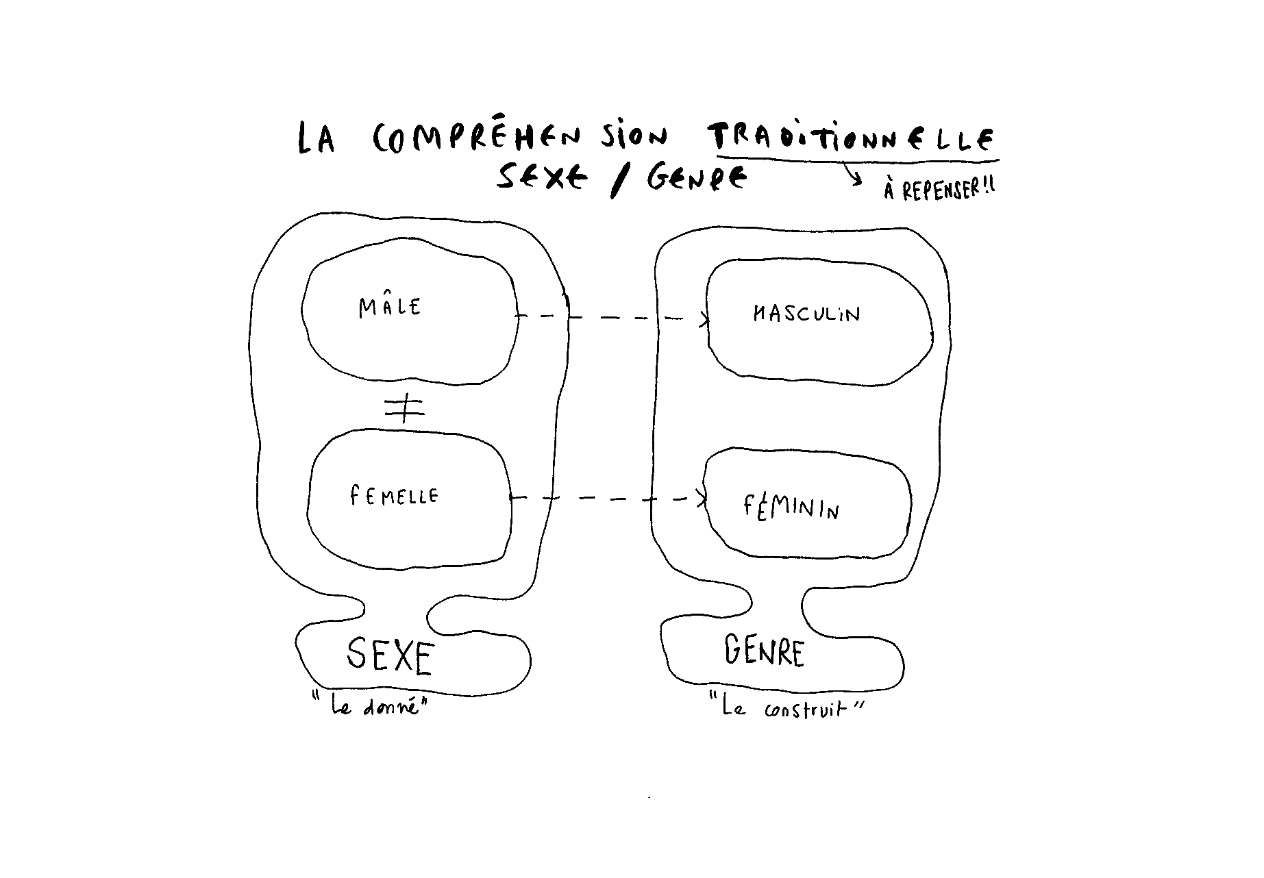 […] bien quʼon ait admis ces dernières années quʼil nʼy a pas de nature, que tout est culture, il reste au sein de cette culture un noyau de nature qui résiste à lʼexamen, une relation qui revêt un caractère dʼinéluctabilité dans la culture comme dans la nature, cʼest la relation hétérosexuelle ou relation obligatoire entre ‹ lʼhomme › et ‹ la femme ›. Ayant posé comme un principe évident, comme une donnée antérieure à toute science lʼinéluctabilité de cette relation, la pensée straight se livre à une interprétation totalisante à la fois de lʼhistoire, de la réalité sociale, de la culture et des sociétés, du langage et de tous les phénomènes subjectifs (62).