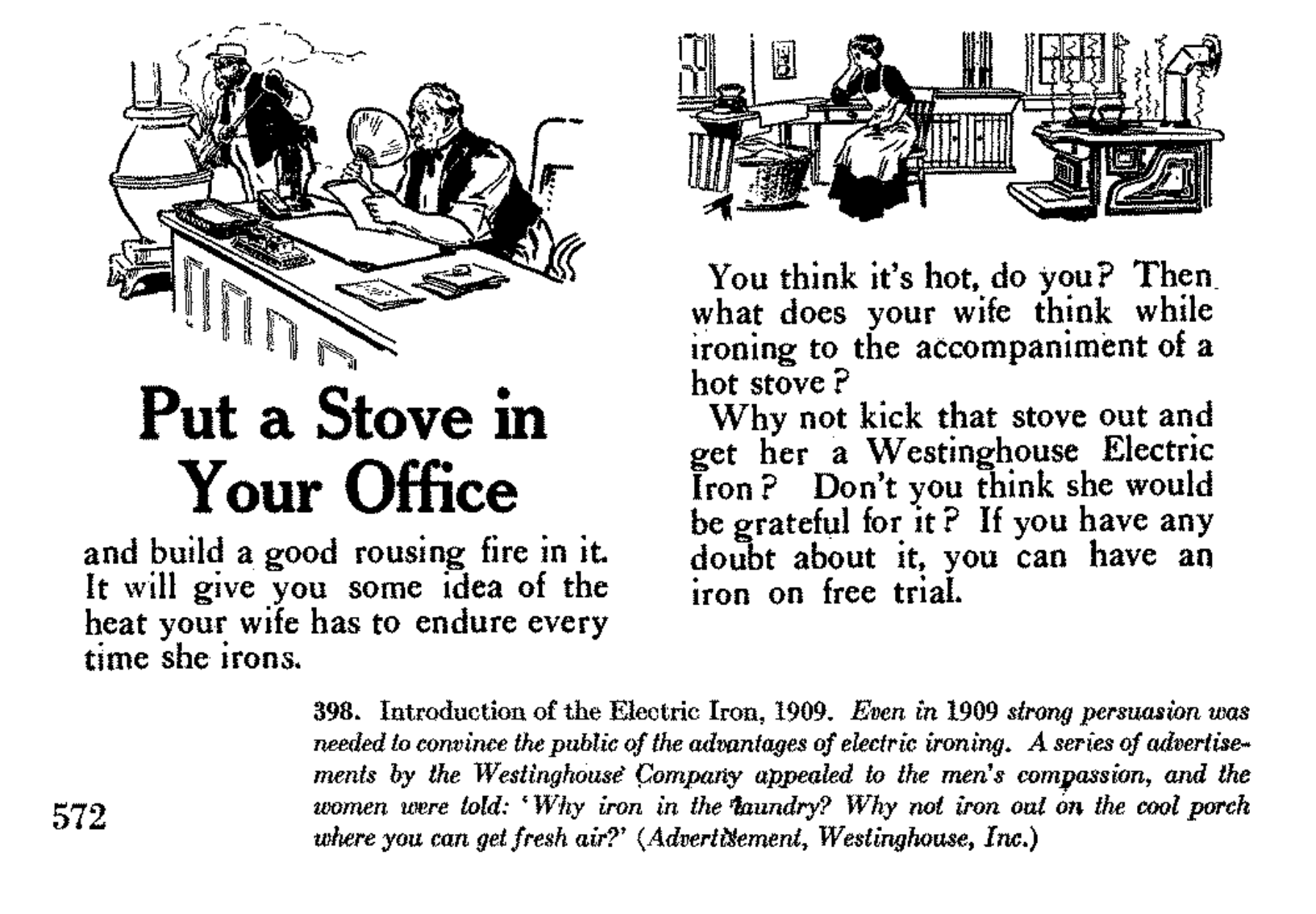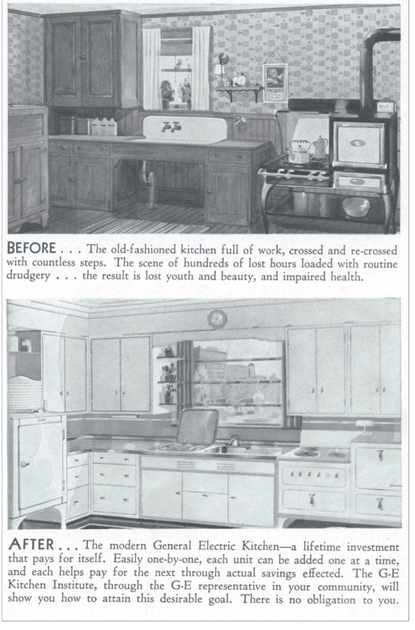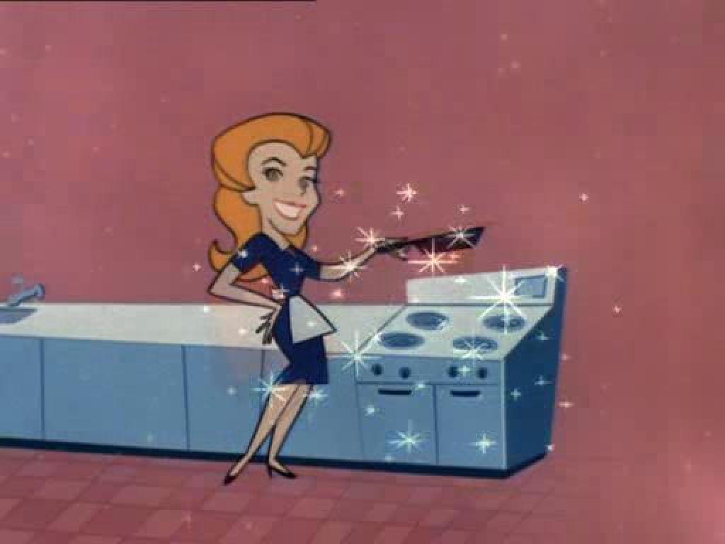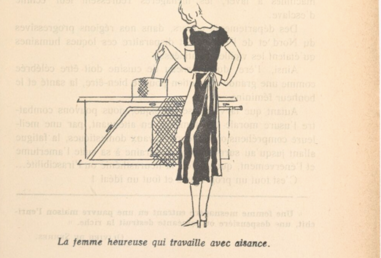 «  Modern appliances were intended as much to remove the stigma from the performance of housework as to reduce the actual work itself, which may be one reason that women were always pictured performing housework with appliances while impeccably dressed, coiffed, and bejeweled  ». ↩ï¸&