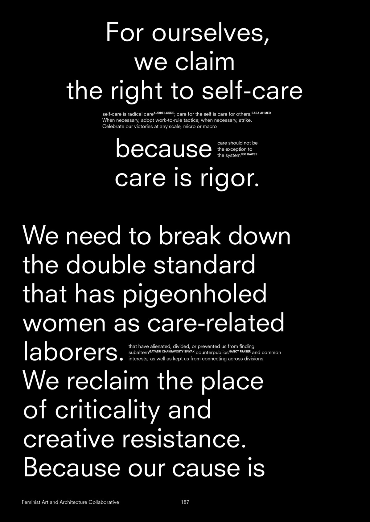 Dans le contexte néolibéral actuel, les politiques LG libérales ‹ naturalisent › le démantèlement de lʼaide sociale et la manière dont les politiques néolibérales reversent la charge de la reproduction sociale sur les familles. Ce faisant, elles échouent à prendre en compte les formes de sociabilité et de reproduction sociale queer et trans* qui sortent de ce cadre, qui sont collectives et qui représentent un travail de care et affectif systématiquement effacé par le capitalisme et le néolibéralisme (2017, 37).