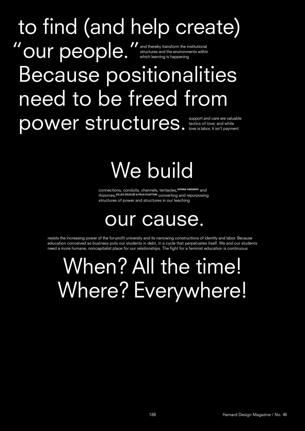 Lorsque nous parlons dʼ‹ hommes blancs ›, nous décrivons une institution. ‹ Hommes blancs › est une institution. En disant cela, que dis-je ? Une institution fait typiquement référence à une structure persistante ou à un mécanisme de lʼordre social qui gouverne le comportement dʼun ensemble dʼindividus dans une communauté donnée. Aussi, lorsque je dis que les ‹ hommes blancs › sont une institution, je ne me réfère pas seulement à ce qui a déjà été institué ou construit mais aux mécanismes qui assurent la persistance de cette structure. […] Ainsi, comment est-ce que ‹ hommes blancs › se bâtit, ou devient bâtiment ? Pensez-y. Un·e praticien·ne mʼa raconté comment ils nommaient les bâtiments dans son institution. Tous des hommes blancs morts, mʼa-t-elle dit. Nous nʼavons pas besoin des noms pour savoir comment les espaces sont organisés afin de recevoir certains corps. Nous nʼavons pas besoin des noms pour savoir pour quoi ou pour qui les bâtiments existent (2014b)13.