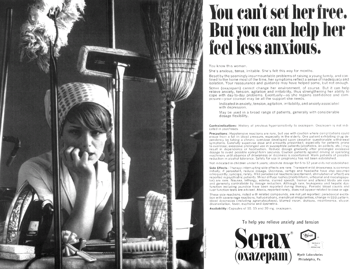 «  [h]ousewife primly dressed on the steps of her suburban home as she kissed her husband good-bye, shuttled her children off to school in the station wagon, then returned home to iron her sheets and wax her floor  ». ↩ï¸&